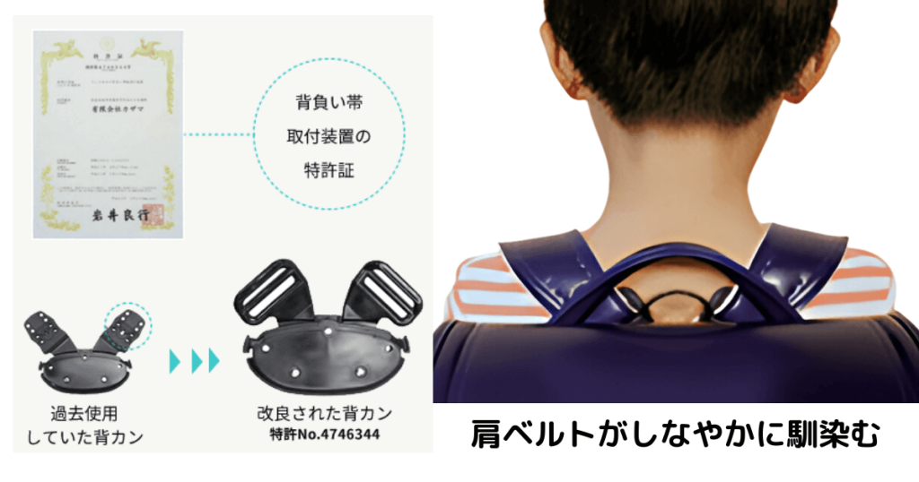 特に注目すべきは、カザマの独自技術である背カン技術です。この技術は、ランドセルの肩ベルトが自然に立ち上がり、背中にぴったりとフィットする設計になっています(特許NO4746344)。